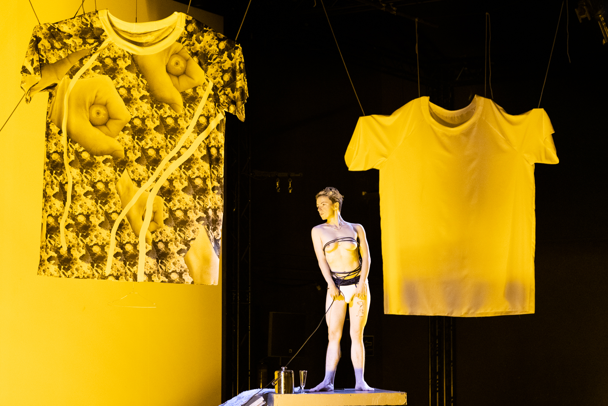 »Sie begibt sich auf Zeitreise in ihrer Auseinandersetzung mit Aktionskünstlerinnen, die in der DDR aktiv waren, inspiriert von ihrer Mutter – selbst Aktionskünstlerin. Und da geht sie weg von diesen unschuldigen Fragen aus dem Bereich „Wie war das damals für dich?“. Sie setzt keine Fragezeichen mehr, Adele setzt Ausrufezeichen. Inspiriert von Performances von Gabriele Stötzer und Else Gabriel versetzt sie sich in die Vorwende-Zeit, stößt den Finger in Wunden, die immer noch nicht verheilt sind und vielleicht nie zuheilen werden. Rollenbilder-Wunden. Wenn sie die Performance „Trans in Küchenutensilien“ von Stötzer auf ihre Art nachspielt, verlässt sie die zeitliche Einordnung, wird allgemeingültig, personifizierter Wunsch nach Auflösung starrer Muster. Mit nacktem Oberkörper, abgeschnürten Brüsten und Mikrofon als Phallussymbol. Im gelben Licht von Klara Lyssy wird sie selbst zum Ausstellungsstück, das allen Rollenbildern ins Gesicht spuckt.« Katharina Stork, LVZ, 13.12.2019